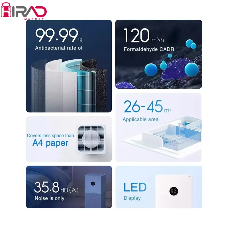 قابلیت کنترل هوشمند از طریق اپلیکیشن Mi Home/Xiaomi Home app – عملکرد عالی در تصفیه ذرات – فیلتر گرد و غبار و گرده – از بین بردن بوی حیوانات، بوی غذا، فرمالدئید، تولوئن و دیگر بوها – فیلتر ذرات ۰.۳ میکرومتری به میزان ۹۹.۹۷% – مجهز به صفحه نمایش LED – یادآوری تعویض فیلتر – مجهز به فیلتر کربن فعال با کیفیت بالا و دوام ۶ ماه تا ۱ سال – پشتیبانی از کنترل صوتی (Ok Google و Alexa) – چندین حالت عملکرد: Auto mode، Night mode و Favourite mode – نشان دادن وضعیت آلودگی هوا با نوار نوری رنگی روی نمایشگر-سبز:هوای تمیز، زرد: آلودگی کم، نارنجی: آلودگی متوسط، قرمز: آلودگی زیاد – مجهز به سنسور دما و رطوبت – مجهز به سنسور لیزری فوق العاده دقیق، جهت مانیتورینگ ذرات ریز ۰.۳ میکرومتری – پایه ای کوچکتر از کاغذ A۴ و اشغال فضای کم